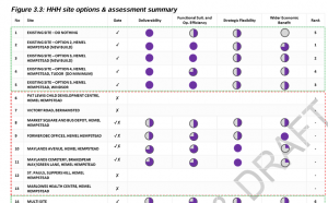 - This table of assessments of site options claims a five-storey £30m building on a busy street is more 'deliverable' than extensions to a modern building in its own grounds