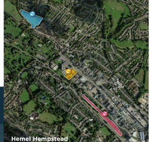 - Below is an image showing DIP’s three ‘priority’ sites for affordable housing – Cherry Bounce in blue, Civic Centre site in yellow, and Water Gardens in red